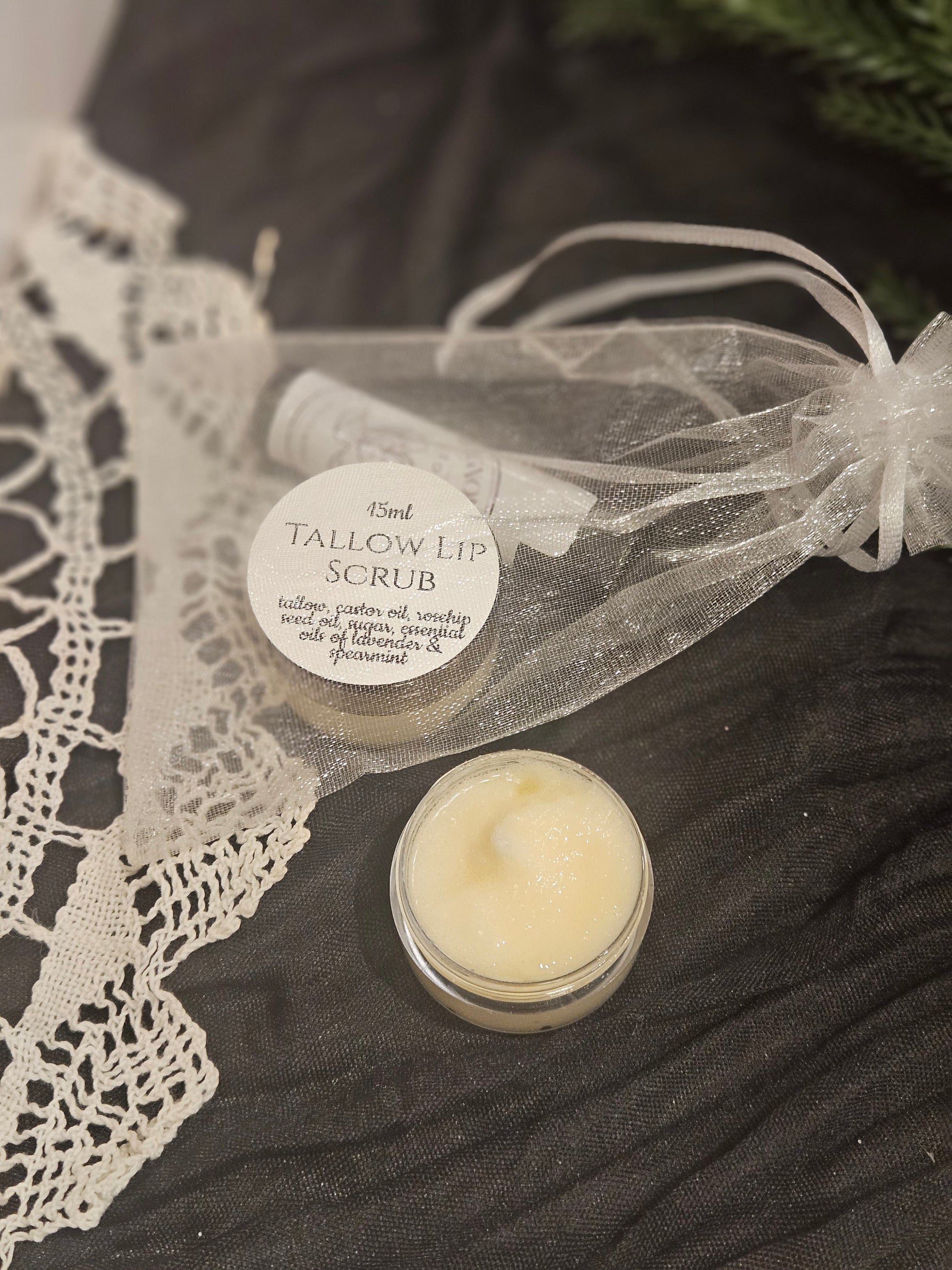 The lip scrub is invaluable for dry climates and chapped or flaking lips, using a clean finger or lip scrub tool, scoop up a very small amount of scrub and gently work around lip area in a circular motion to smooth and exfoliate. Do not scrub heavily. Gently wipe remainder off and finish with lip balm to nurture and rejuvenate. The scrub is an uplifting and nourishing blend of tallow, rosehip seed oil, castor oil, sugar, and an uplifting essential oil blend of spearmint and lavender.